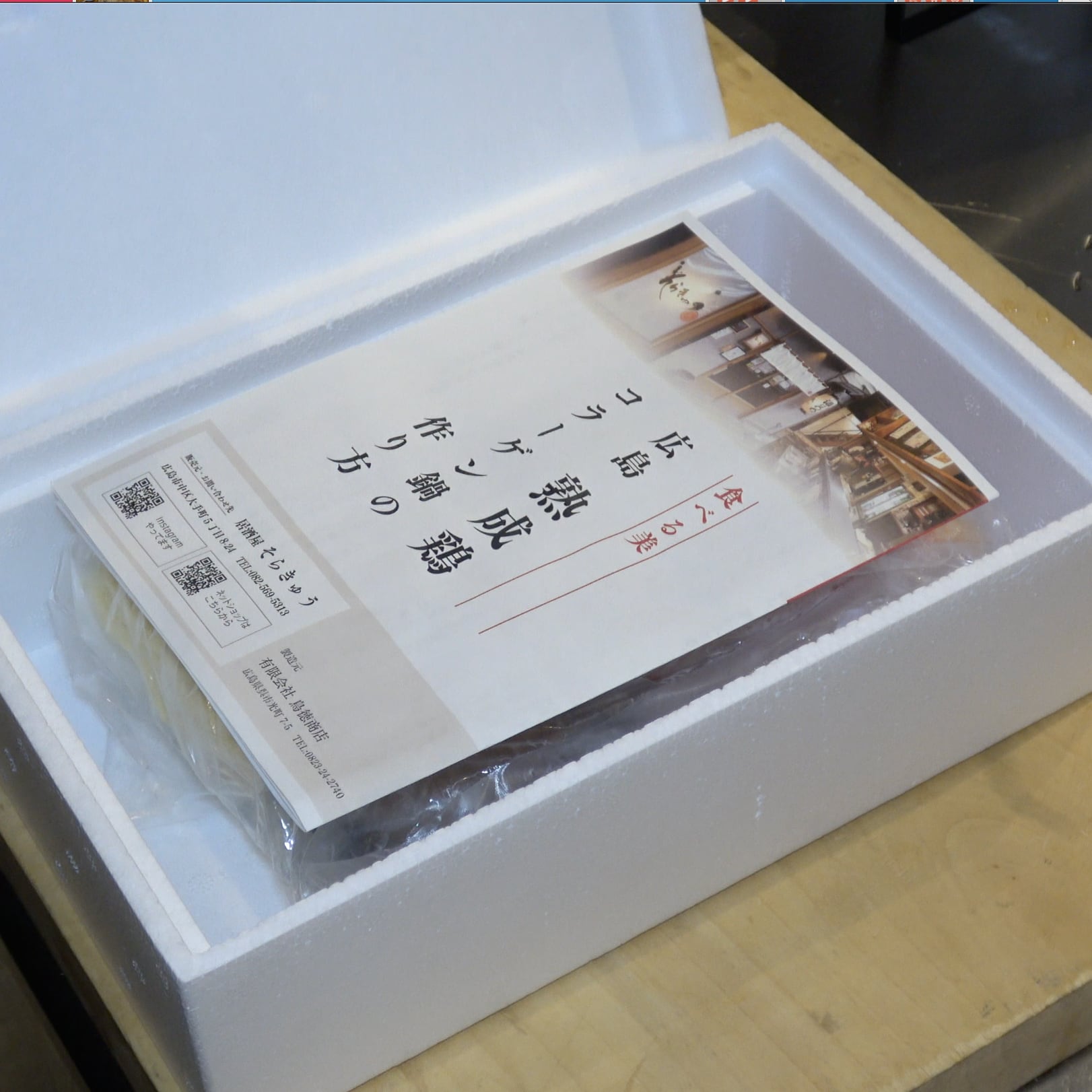 広島県北部で飼育された高宮熟成鶏を約9時間かけて抽出した濃厚なコラーゲンスープ。